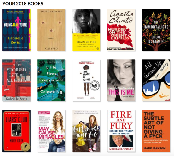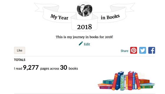 Factually inaccurate already! After taking this screen shot, I added a book I forgot about… and I read 31 books and ~9,500 pages in 2018