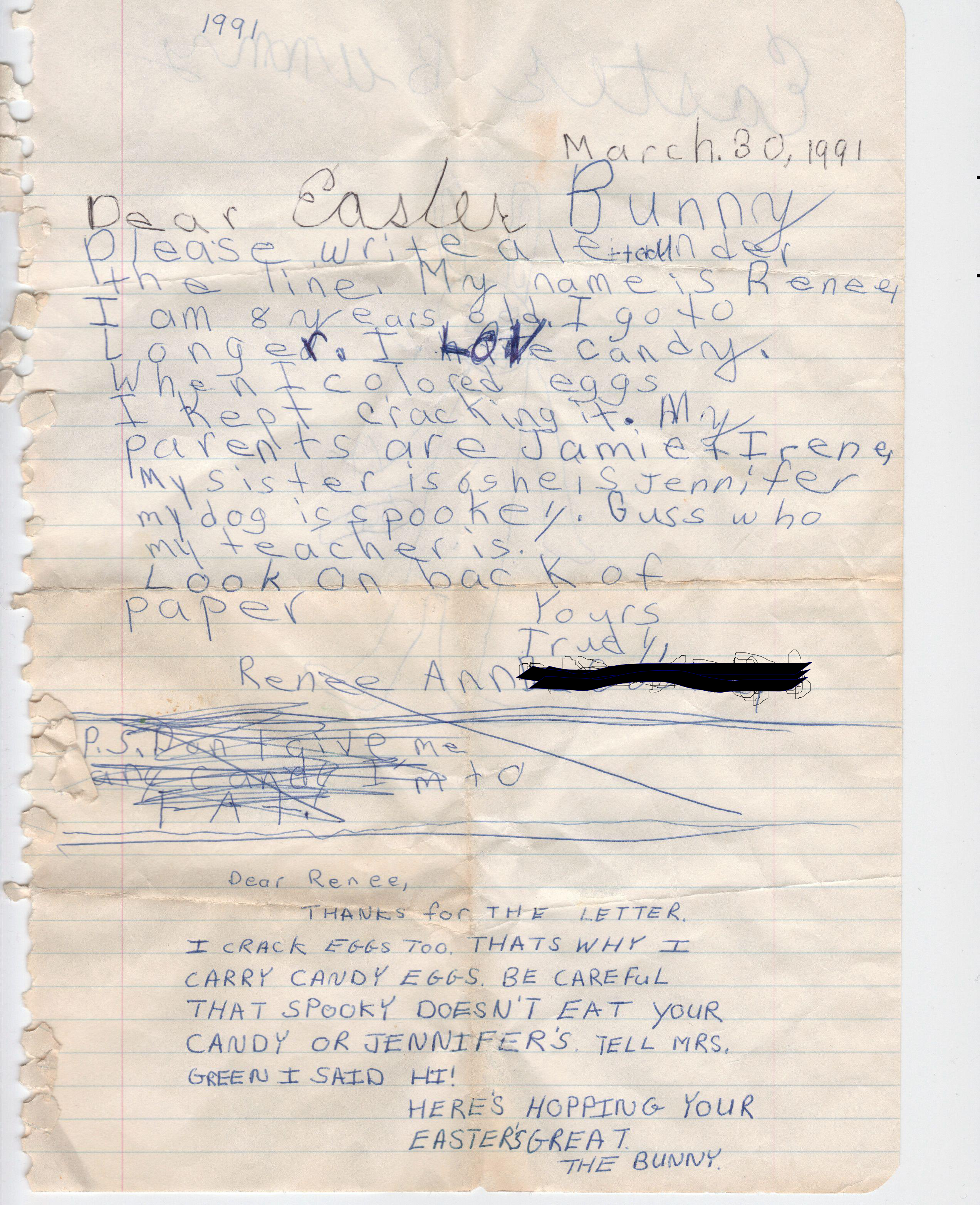 That last part of broke my heart when I read it (it’s the part that’s all crossed off on the letter because The Easter Bunny/my mom crossed it out. Then she attempted to disguise her handwriting [after the first four words] by writing in all caps so I would be fooled. And this is why I love my mother). At the same time, I found it so interesting that I could actually see my internal struggle manifesting itself. I wrote this letter and, on one hand, wanted it to seem like I was totally normal. At the same time, I felt anything but.