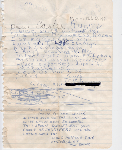 As my mom and I were decorating for Easter a few weeks ago, we discovered that one of our oldest decorations, a basket shaped like a rabbit that, for years, held eggs, had been damaged by stuff from our roof. Before we threw it out, we cleaned everything out of it. I love finding things from the past, things I’d forgotten all about or never remembered in the first place, so I was pretty pumped to find a letter that I’d written to the Easter Bunny when I was in second grade. Then I read the letter and thought to myself, “Wow. Our society is full of really awful people.” The letter was actually really sad.