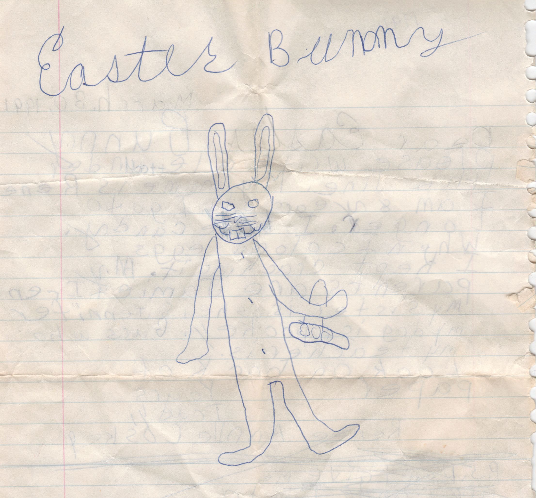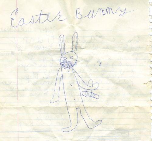 But let’s end on a lighter note, shall we? After my mom and I were finished discussing the depressing implications of that letter, I flipped it over and laughed until I had tears in my eyes. I drew the Easter Bunny a picture (click to enlarge):