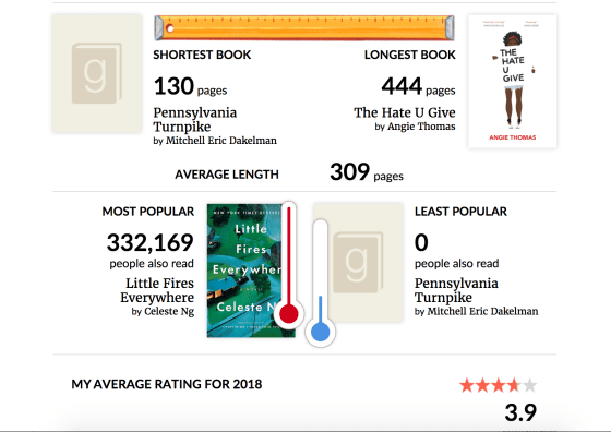 Factually inaccurate already! After taking this screen shot, I added a book I forgot about… and I read 31 books and ~9,500 pages in 2018